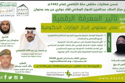 جدة _ مرفت طيب يقيم مركز الملك عبدالعزيز للحوار الوطني في منطقة مكة المكرمة اللقاء الحواري السابع عن بعد (تأثير المعرفة...