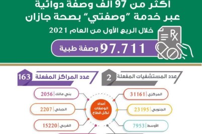 جازان - عفاف مدخلي أوضحت صحة جازان أنه تم صرف 97.711 وصفة طيبة خلال الربع الأول من عام 2021م...