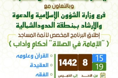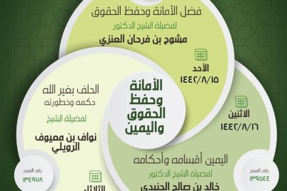 ينفذ فرع وزارة الشؤون الإسلامية والدعوة والإرشاد في منطقة الحدود الشمالية البرنامج الدعوي الأمانة وحفظ الحقوق واليمين بداية بمحاضرة عنوانها (فضل الأمانة...
