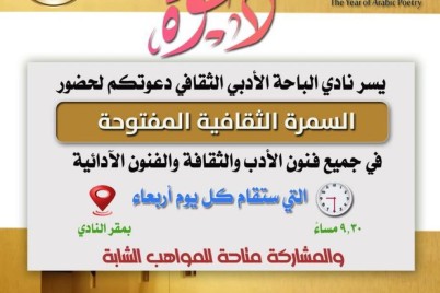 الحدث - ليلى الحامد يقيم نادي الباحة الأدبي برنامج "السمرة الثقافية المفتوحة" في تمام الساعة التاسعة والنصف من مساء كل...