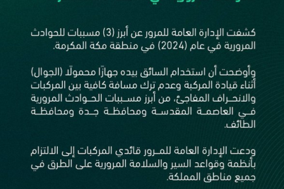 كشفت الإدارة العامة للمرور عن أبرز ثلاثة أسباب تقف وراء الحوادث المرورية التي وقعت في عام 2024 بمنطقة مكة المكرمة....