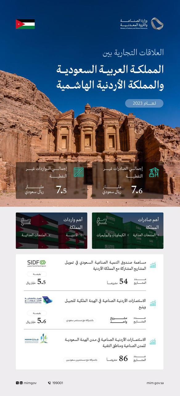الجدير بالذكر أن حجم صادرات المملكة إلى الأردن عام 2023 بلغ 7.6 مليار ريال، فيما وصل إجمالي وارداتها من الأردن 7.5 مليار ريال، وتمثلت أهم صادرات المملكة إلى الأردن في المنتجات الغذائية، والكيماويات والبوليمرات، ومواد البناء، بينما شملت أهم وارداتها من الأدوية، والمنتجات الغذائية.