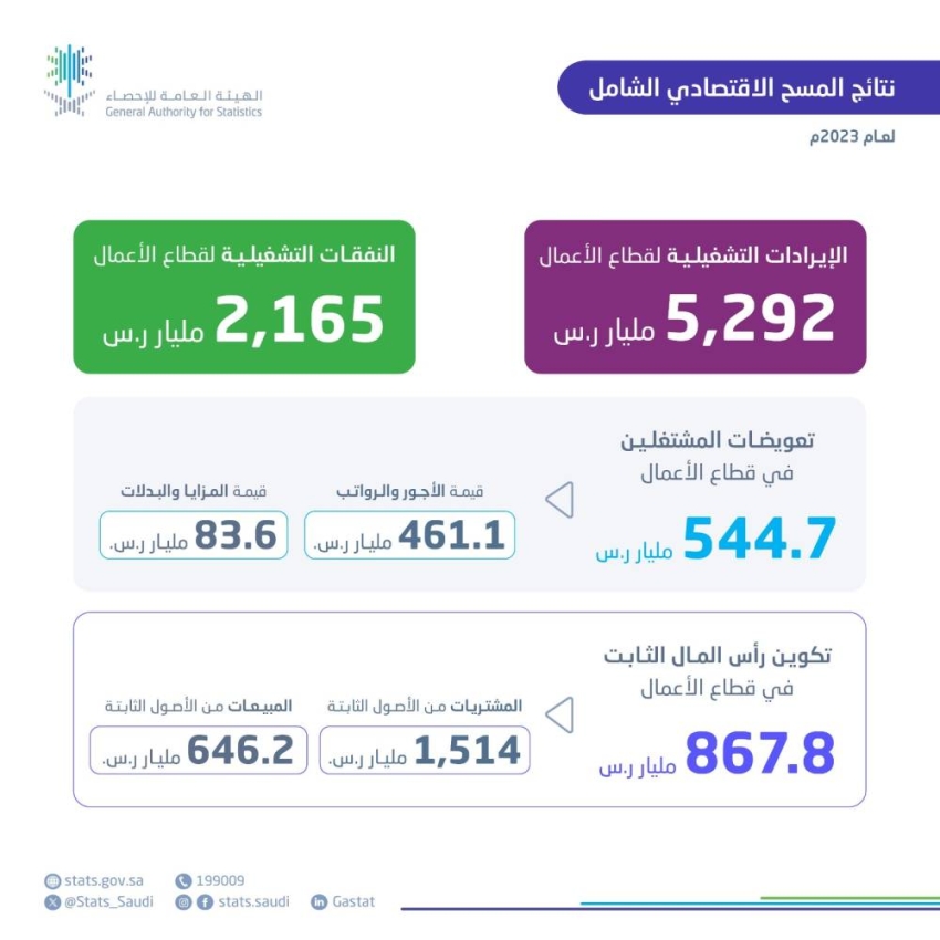 وأظهرت نتائج المسح الاقتصادي الشامل للعام 2023م، أن إجمالي الإيرادات التشغيلية بلغت 5،292 مليار ريال سعودي، في حين بلغ إجمالي النفقات التشغيلية 2،165 مليار ريال سعودي، كما بلغت تعويضات المشتغلين في القطاع 544.7 مليار ريال سعودي, مشيرة إلى أن قيمة إجمالي تكوين رأس المال الثابت لهذا القطاع بلغت 867.8 مليار ريال سعودي.وتسهم نتائج المسح الاقتصادي الشامل في تكوين بيانات ومؤشرات إحصائية على درجة عالية من الدقة والشمولية والاحترافية؛ لتبرز حجم النمو الاقتصادي الحقيقي والفعلي في المملكة، وتلبية متطلبات المنظمات الإحصائية، والجهات المحلية والإقليمية والدولية.