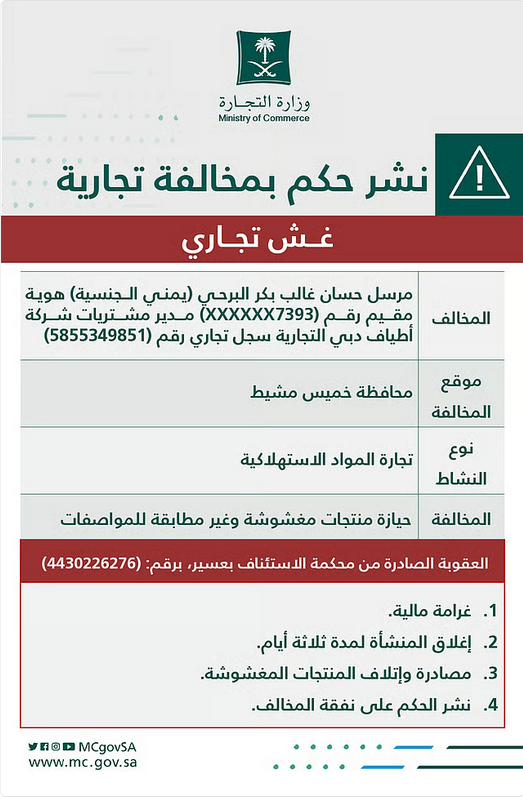 وقد صدر حكم قضائي نهائي من محكمة الاستئناف بمنطقة عسير يتضمن فرض غرامة مالية على المخالف، إغلاق مقر المنشأة لمدة ثلاثة أيام، مصادرة وإتلاف المنتجات المغشوشة، ونشر الحكم على نفقة المخالف.