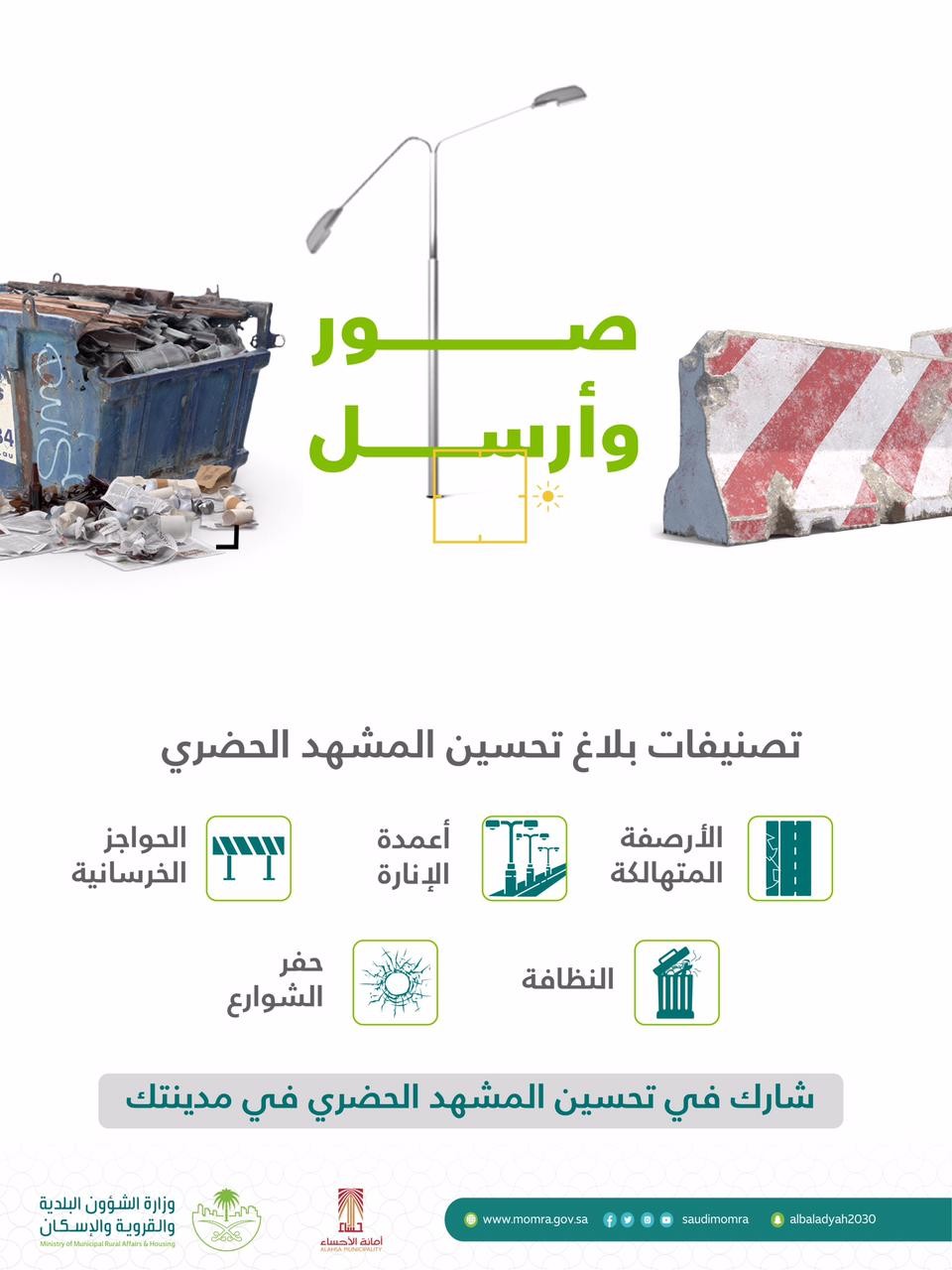 أطلقت أمانة الأحساء حملة #صور_وأرسل ؛ والتي تهدف من خلالها إلى تمكين أفراد المجتمع وإشراكهم بالمساهمة في تحسين المشهد الحضري للارتقاء بجودة الحياة. ضمن برامج وأهداف رؤية المملكة 2030.
