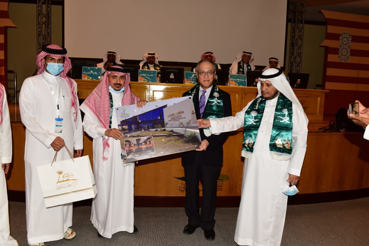 وقدم الدكتور "الشهري" درعاً تذكارياً بهذه المناسبة لمعالي سفير دولة اليابان، على أنغام الفلكلور النجدي، وكلمات شاعر الدرعية "عبدالرحمن بن صفيان": (نحمد الله جت على ماتمنى).