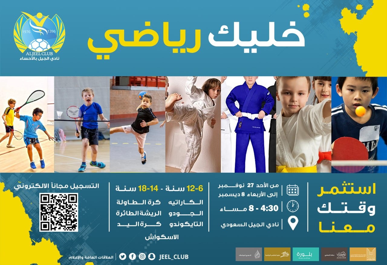 أطلقت إدارة الألعاب المختلفة بنادي الجيل الرياضي برنامج (خليك رياضي) والذي يهدف إلى استثمار وقت الشباب خلال فترة إجازتهم من يوم الأحد القادم 27/11/2021 وحتى يوم الأربعاء 8/12/2021 وذلك في مقر نادي الجيل بحي الملك فهد بالهفوف.