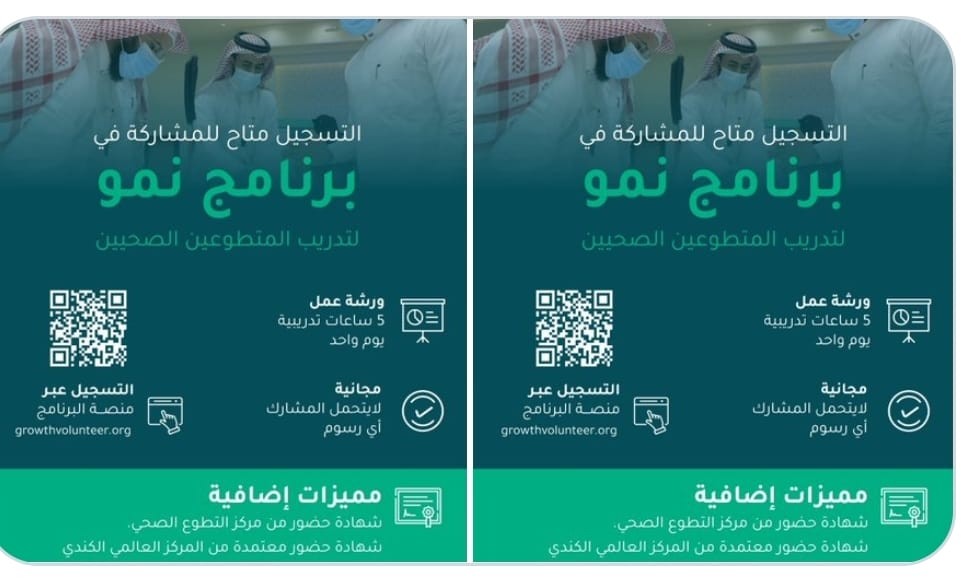 برنامج "نمو" يهدف إلى تدريب المتطوعين الصحيين، وفقًا لأفضل الممارسات العالمية؛ ويسعى البرنامج لتأهيلهم وتعريفهم بممارسات التطوع الصحي، بالإضافة إلى المهارات التطوع والمشاركة المجتمعية، بما لا يقل عن 20 ساعة تدريبية.