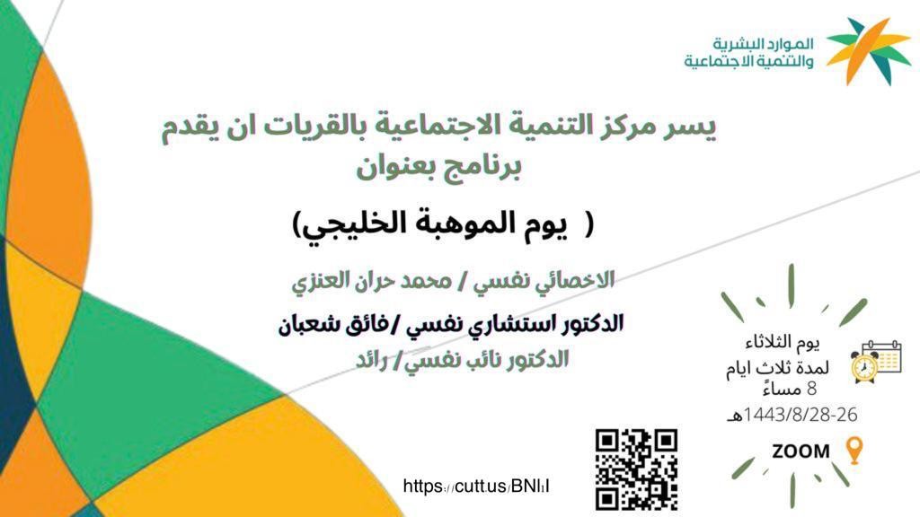 احتفل مركز التنميه الاجتماعيه بمحافظة القريات برنامج باليوم الخليجي للموهبة بالشراكه مع التعليم من خلال اقامة برنامج عن طريق الزوم لمدة ثلاثة ايام خلال الفتره ٢٦-٢٨/ ١٤٤٣هـ الساعه الثامنه مساءوإستهدف المهتمين بمجال الموهبه والابداع .