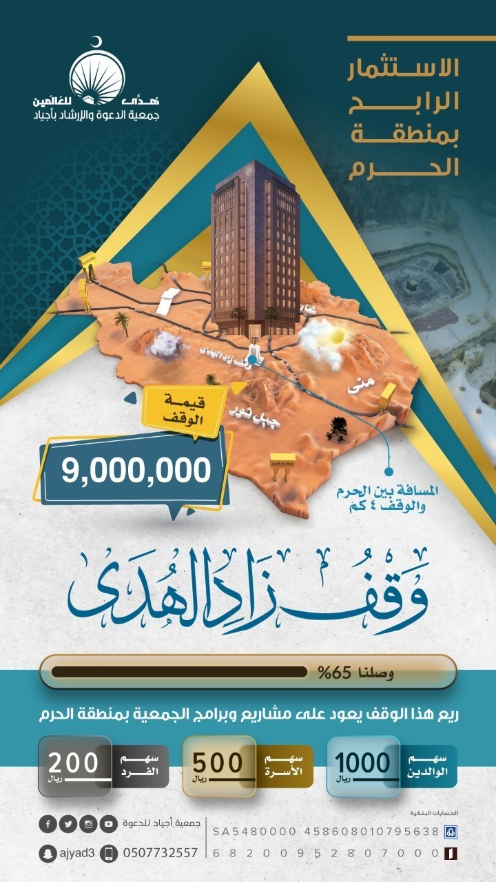أطلقت جمعية الدعوة والإرشاد وتوعية الجاليات بأجياد في مكة المكرمة وقفها الخيري تحت مسمى "زاد الهدى"، وهو مشروع وقفيٌ استثماري, يعود ريعه بالنفع لتغطية مشاريع وبرامج الجمعية المقدمة لضيوف الرحمن من المعتمرين والحجاج وسكان البيئة المحيطة بمنطقة الحرم والجاليات القاطنة فيها.