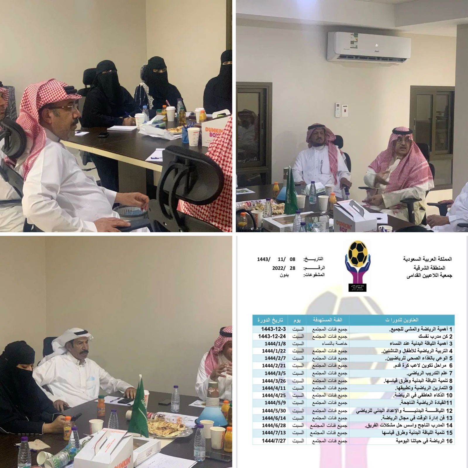 بعد موافقة وزارة الرياضة وضمن البرامج التي ستقدمها جمعية اللاعبين القدامى بالمنطقة الشرقية تقدم المدربة المستشارة سناء الخالدي عدد 16 دورة رياضية التي سيستفيد منها الجميع التي تهم جميع فئات المجتمع منها دورة خاصة للنساء والتي ستكون عن طريق زوم ( Zoom ) وستبدأ اول الدورات في 3-12-1443هـ وآخر دورة  ستقام في 27-7-1444هـ