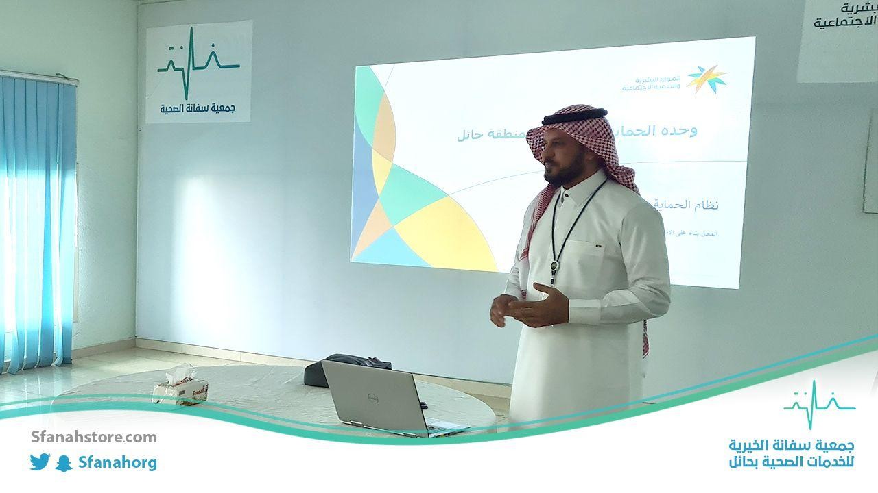 ضمن المبادرات التي تقيمها وحدة الحماية الاجتماعية بمنطقة حائل وبموافقة سعادة مساعد مدير عام فرع الوزارة للتنمية بالمنطقة ، أُقيمت ورشة عمل في مقر جمعية سفانة الصحية بعنوان "آلية بلاغات العنف الأسري والإجراءات النظامية في متابعتها" ألقاها مدير وحدة الحماية الاجتماعيةالاجتماعية أ. فهد سعود العتيبي والأخصائي الاجتماعي أ. يونس حماد الشمري