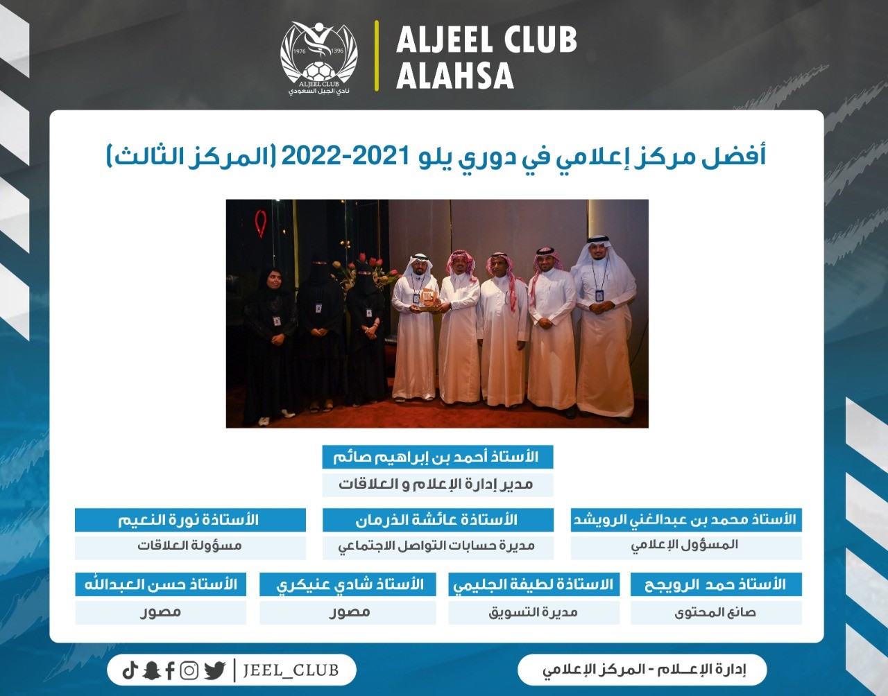 احتفى مجلس إدارة نادي الجيل مساء الأحد 30 أكتوبر 2022م بأعضاء المركز الإعلامي للنادي على إثر تحقيقهم لجائز أفضل مركز إعلامي في دوري يلو 2021-2022 (المركز الثالث) في حفل تم من خلاله تكريم إدارة المركز الإعلامي من قبل رئيس مجلس الإدارة الأستاذ فهد بن أحمد الغنيم ومجلس إدارته.