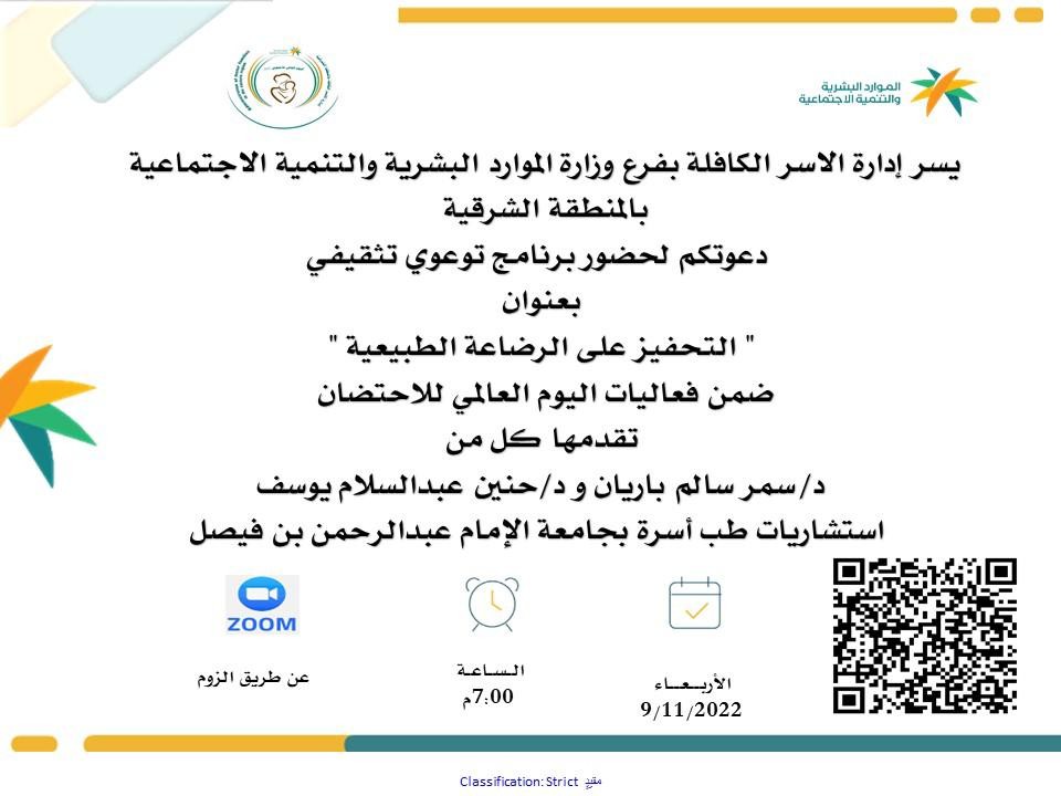 ضمن فعاليات اليوم العالمي للاحتضان و الذي يوافق يوم غد الأربعاء ٩ نوفمبر ٢٠٢٢م تنظم إدارة الأسر الكافلة بفرع وزارة الموارد البشرية والتنمية الاجتماعية في المنطقة الشرقية برنامجاً توعويآ تثقيفياً بعنوان " التحفيز على الرضاعة الطبيعية " تقدمه الدكتورة سمر سالم باريان والدكتورة حنين عبدالسلام يوسف استشاريات طب الأسرة والمجتمع بجامعة الإمام عبدالرحمن بن فيصل .