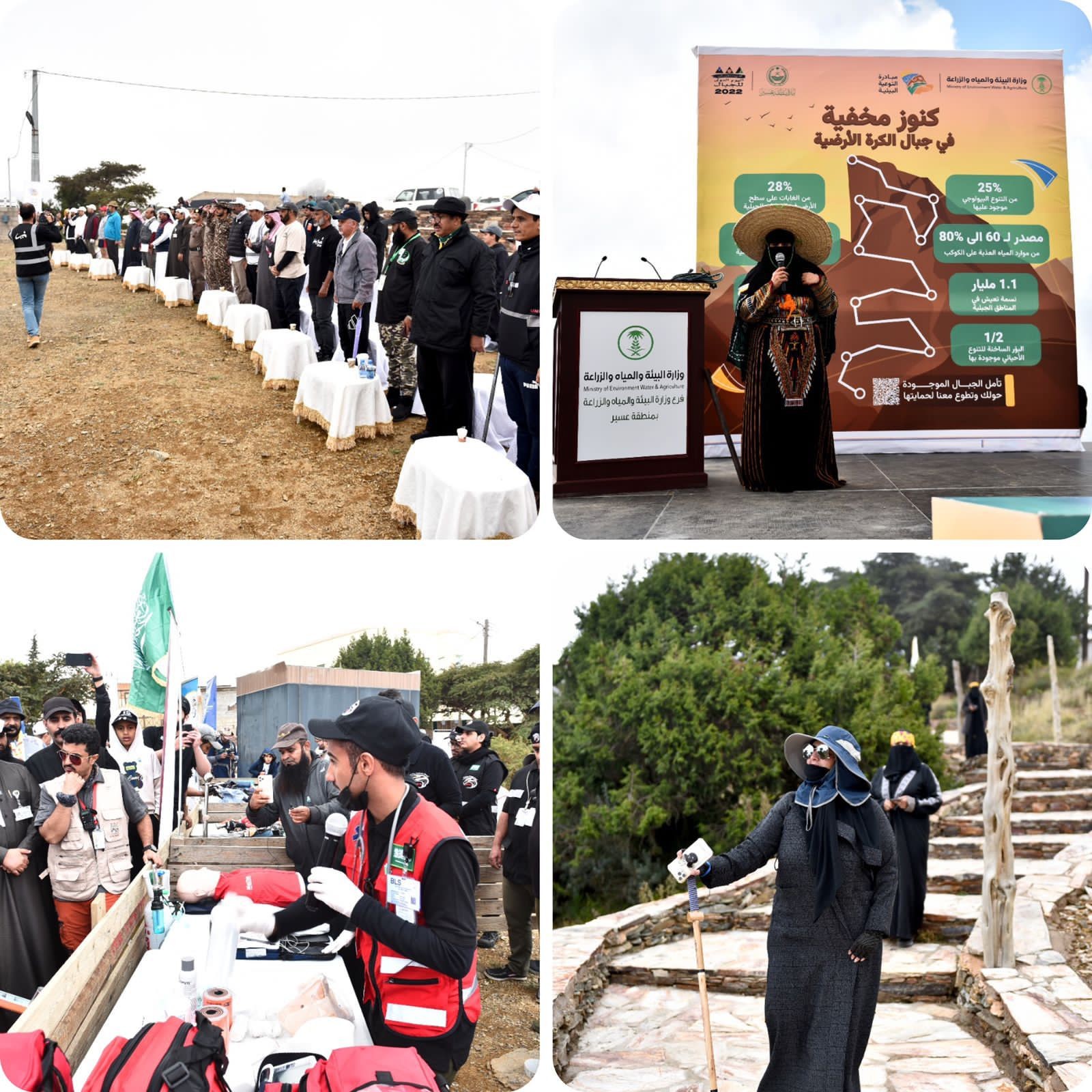 نفذ فرع وزارة البيئة والمياه والزراعة بمنطقة عسير اليوم فعالية،الاحتفاء باليوم الدولي للجبال 2022م ، تحت عنوان "المرأة تحرك الجبال", في مسار السعادة بربيعة ورفيدة، الفعالية أقامها فرع الوزارة بعسير بالتعاون مع مبادرة التوعية البيئية إحدى مبادرات التحول الوطني التي تشرف عليها الوزارة وشاركت عدة جهات في انجاح هذه المبادرة التي شارك فيها أكثر من 500 شخص من مختلف الاعمار،والجهات المشاركة هي إمارة منطقة عسير ، هيئة تطوير منطقة عسير ، شرطة منطقة عسير،الدفاع المدني ، الهلال الأحمر،أمانة منطقة عسير ، بلدية طبب،التلفزيون السعودي، المركز الوطني لتنمية الغطاء النباتي ومكافحة التصحر، المركز الوطني للرقابة على الالتزام البيئي ، فريق الكشافة بمحافظة رجال ألمع ، جمعية دعم للبحث والإنقاذ ، فريق ومشاة هايكنج الجنوب وغيرهم من الفرق التطوعية وشهدت الفعالية حضور نسائي فعال وقد بدأت الفعالية بالسلام الملكي ومن ثم القران كريم ثم كلمة لمدير عام فرع وزارة البيئة والمياه والزراعة بمنطقة عسير المهندس عبدالله بن حسن الويمني القاها نيابة عنه مدير ادارة البيئة بالفرع المهندس احمد محمد ال مجثل وتجول الحضور على العروض الخاص بالهايكنق والقت المواطنة أم احمد كلمة نيابة عن المرأة الجبلية ثم شارك الجميع في المسار الجبلي بشكل ناجح وشيق في احد أجمل المواقع في منطقة عسير عقب ذلك وجبة غداء من غذاء أهل المنطقة و تناول الشاي وسط انغام الناي العسيري.
