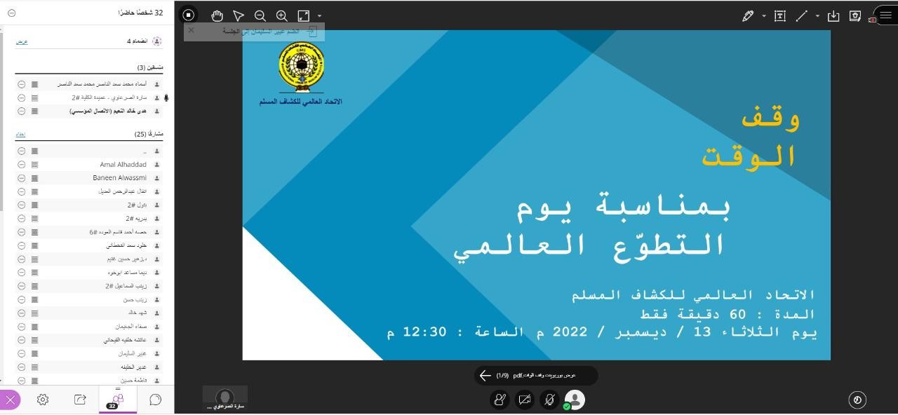 كما تناولت الورشة أهمية التطوع في جميع جوانب الحياه، التعريف بالوقف، أمثلة ومواقف عن وقف الوقت، واختتمت بذكر عظماء أوقفوا وقتهم تطوعاً..