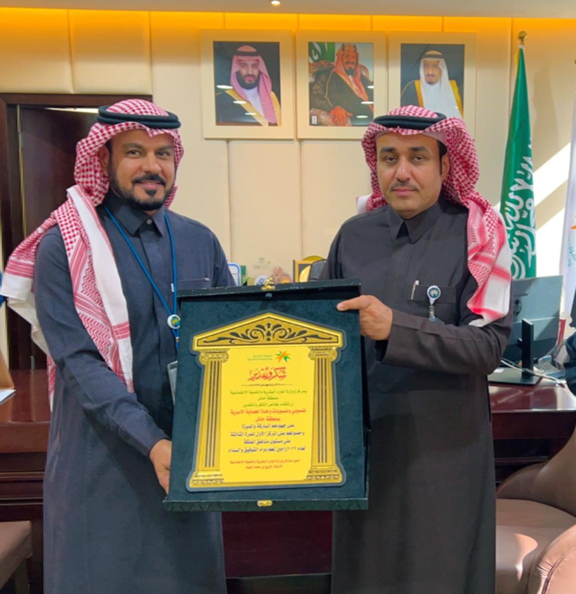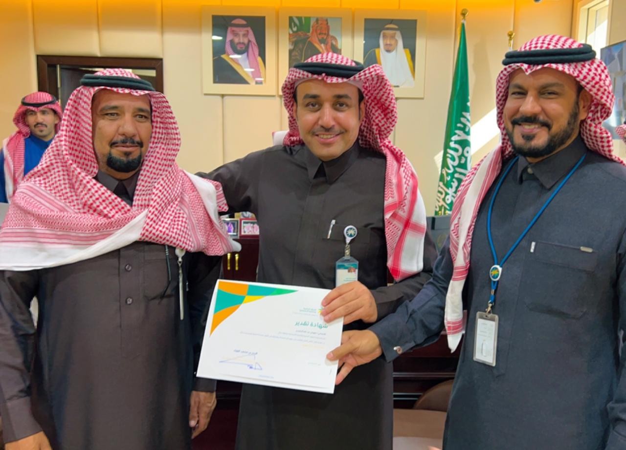 حيث تم تكريم مكتب العمل ممثلاً بمدير إدارة التفتيش الأستاذ سعود دبي الشمري على أدائهم المتميز في الجولات الرقابية المساهمة في متابعة الالتزام الأنشطة بقرارات التوطين و نشر الوعي وتبصير المنشآت بكافة الأنظمة .