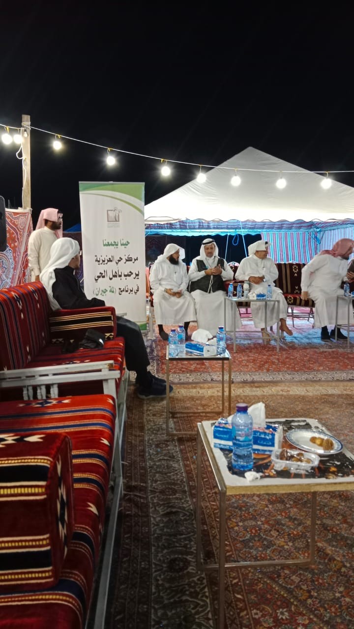 أقام مركز حي العزيزية مساء الأحد الموافق 7/ 7/ 1444 هـ اللقاء الخامس لبرنامج (لمة جيران) برعاية كريمة من فضيلة الشيخ د. مجدي باسلوم، وذلك في مخيم د.عبدالمؤمن صباغ و م. أحمد أبو سليمان.