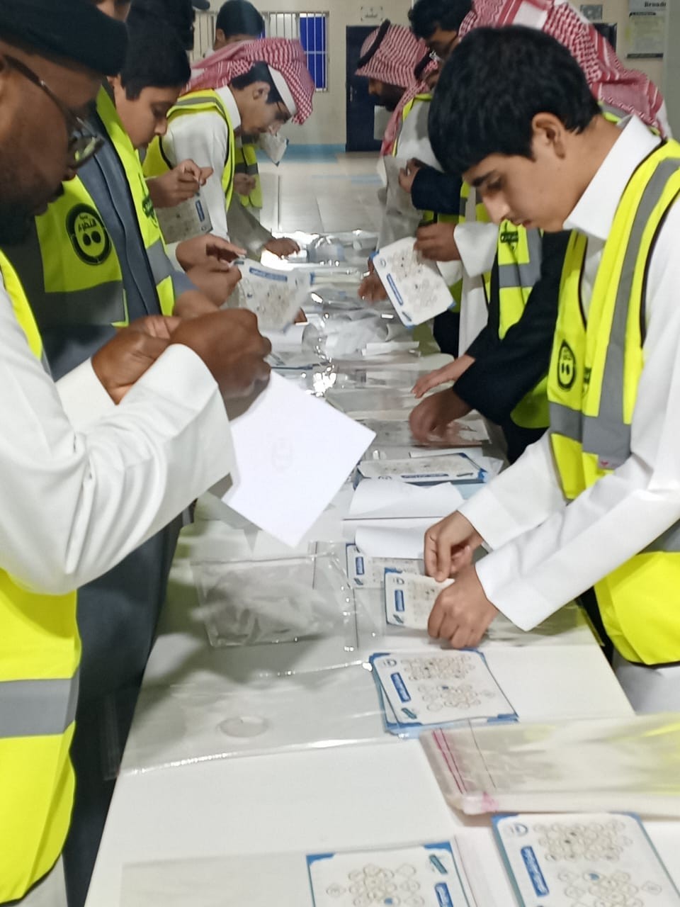 مساءً في ثانوية عمرو بن حزم بالخفجي للبدء في تجهيز وتغليف وترتيب وجبة الإفطار الرمضانية لتوزيعها في إفطار يوم الأحد .
