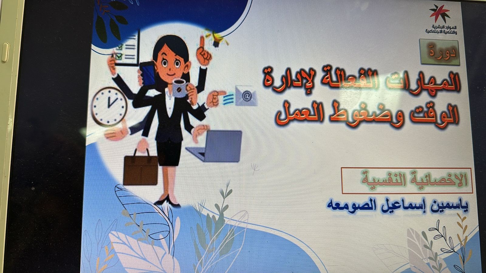 استهدفت موظفات مركز التنمية وذلك بهدف توضيح مفهوم إدارة الوقت، و استعراض مهارات الوقت ومعوقات إدارته، بيان أهم الاستراتيجيات لإدارة الوقت بشكل فعال، عرض مفهوم ضغوط العمل، وعلامات ضغط العمل النفسي والجسدي، شرح مصادر ضغط العمل وأسبابها ومهارات التعامل مع ضغوط العمل.