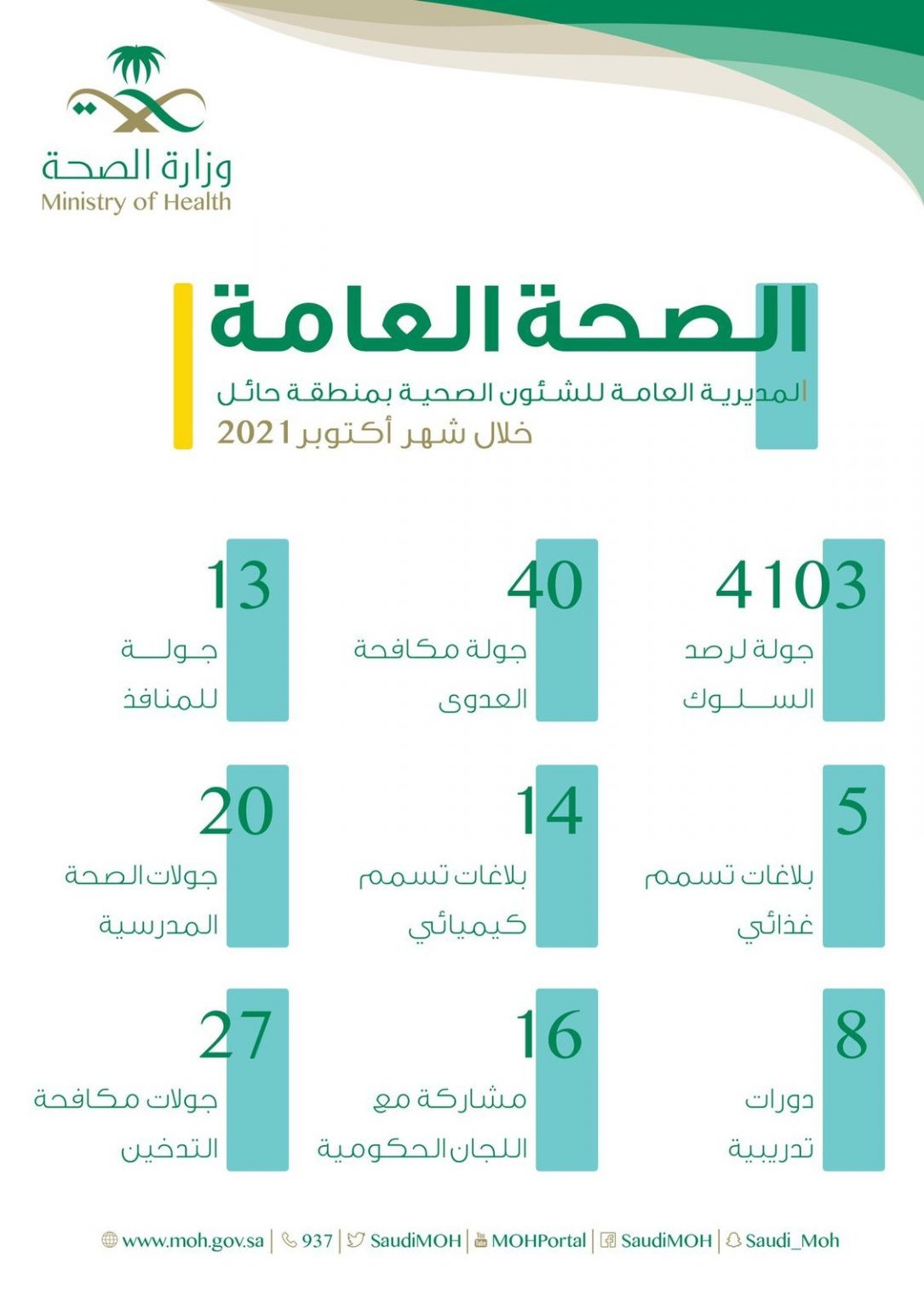 نفذت المديرية العامة للشؤون الصحية بمنطقة حائل، ممثلة في إدارة الصحة العامة خلال شهر أكتوبر من هذا العام 2021م ، 4219 جولة لرصد السلوكيات والمخالفات الصحية.