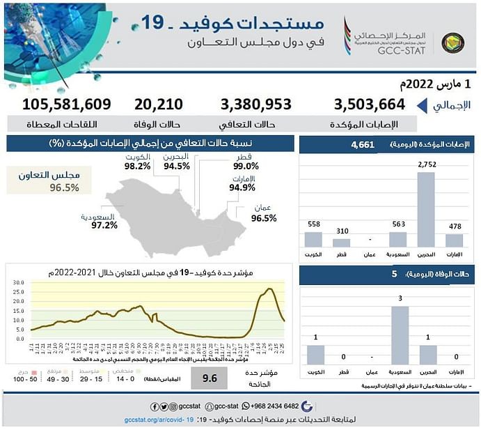 استمرت حملات تقديم لقاحات كورونا لمواطني دول مجلس التعاون، فيما بلغت نسبة التعافي من الفيروس بالسعودية 97.2 %، وقال مركز الإحصاء الخليجي عبر حسابه في تويتر: إن اللقاحات مستمرة بدول التعاون، وبلغت الإصابات المؤكّدة 3,503,664 حالة، وإجمالي حالات التعافي 3,380,953 حالة، وإجمالي حالات الوفاة بلغ 20,210 حالات حتى يوم أمس.