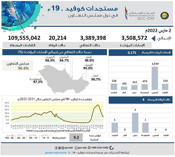 وقال مركز الإحصاء الخليجي عبر حسابه في تويتر: إن إجمالي اللقاحات المعطاة بدول التعاون بلغ 109.555.042 جرعة، وبلغت الإصابات المؤكدة 3.508.572 حالة، وإجمالي حالات التعافي 3.389.398 حالة، وإجمالي حالات الوفاة بلغ 20.214 حالة حتى يوم أمس.