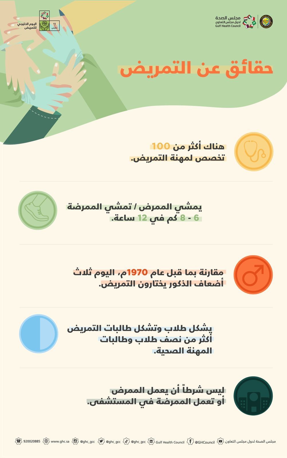 نشر مجلس الصحة الخليجي عبر حسابة الرسمي في تويتر العديد من الحقائق حول مهنة التمريض التي خصص لها بين دول الخليج يوم يحتفى بها لما لها من أهميه بالغة في سير عجلة النظام الصحي، وذكر المجلس عدة حقائق منها : أن لمهنة التمريض أكثر من 100 تخصص منوعة، وأيضاً تم قياس معدل مشي الممرض خلال مهام عمله اليومية بما يقارب من 6 إلى 8 كم كل 12 ساعة وذلك من خلال عمله الدئوب في التنقل بين المرضى والاهتمام بشؤونهم الطبية ومتابعة كل متطلباتهم الطبية المقررة لهم، وأضاف المجلس ان أختيار الذكور لمهنة التمريض تضاعفت ثلاث مرات مقارنة عما كانت عليه في عام 1970م، كما ان التمريض بجنسية يشكلون أكثر من نصف المهن الصحية المختلفة، حيث أن مهنة التمريض لا تقتصر عملها على المستشفيات فقط بل لها مجالات متعددة في مختلف التخصصات الطبية المتنوعة.