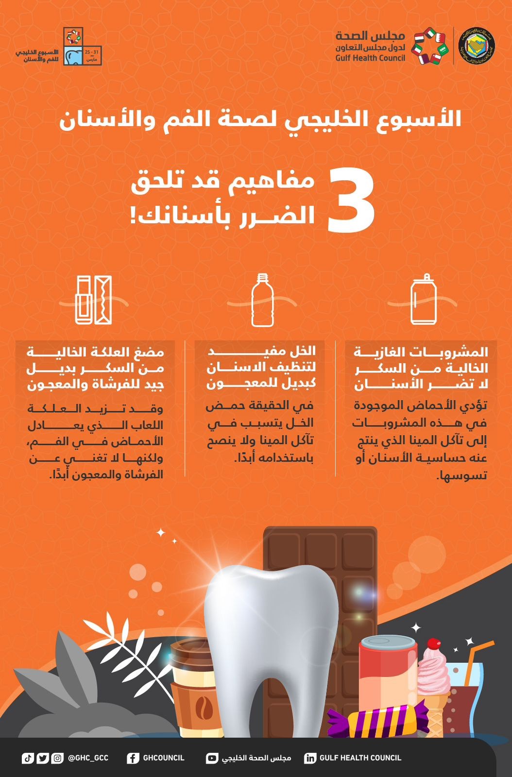 ونوه المجلس من خلال الأسبوع الخليجي لصحة الفم والأسنان إلى ثلاثة مفاهيم خاطئة قد تلحق الضرر بأسنانك وهي: إن المشروبات الغازية الخالية من السكر لا تضر الأسنان وفي الحقيقة أن الأحماض الموجودة في هذه المشروبات تؤدي إلى تآكل الميناء الذي ينتج عنه حساسية الأسنان أو تسوسها، والمفهوم الثاني هو أن الخل مفيد لتنظيف الأسنان كبديل للمعجون، ولكن الحقيقة أن حمض الخل يتسبب في تآكل الميناء ولا ينصح باستخدامه أبدا، والمفهوم الثالث والأخير أن مضغ العلكة الخالية من السكر بديل جيد للفرشاة والمعجون، والحقيقة أن العلكة قد تزيد اللعاب الذي يعادل الأحماض في الفم ولكنها لا تغني عن الفرشاة والمعجون أبدا.