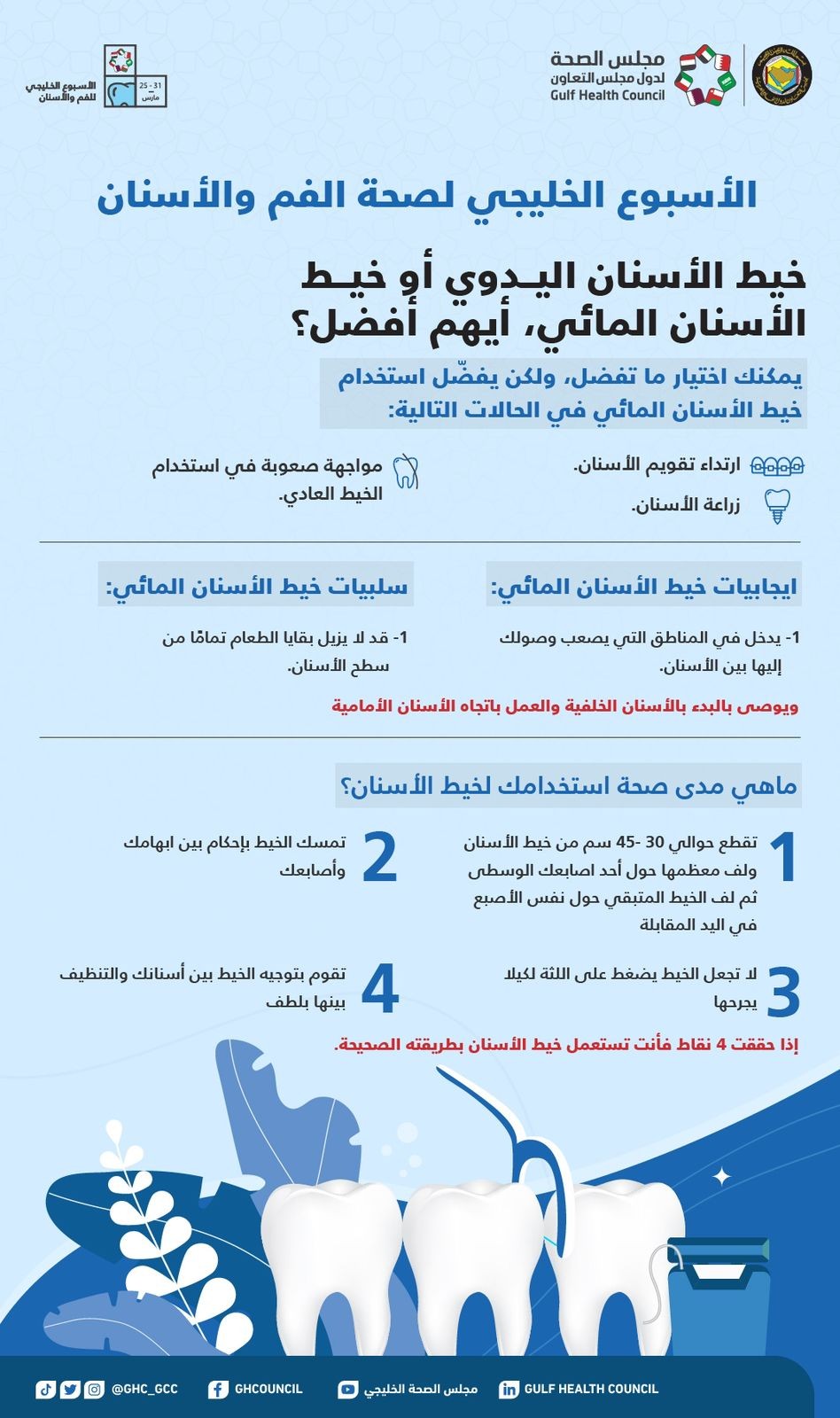 وذكر المجلس أربع نصائح لمن يستخدم خيط الأسنان اليدوي بأن يقوم الفرد بقطع ما يقارب من 30-45 سم من الخيط ولف معظمها حول الأصبع الأوسط وباقي الخيط يتم لفه على نفس الأصبع من اليد الأخرى، وعدم ترك الخيط يضغط على اللثة كي لا يتم جرحها.