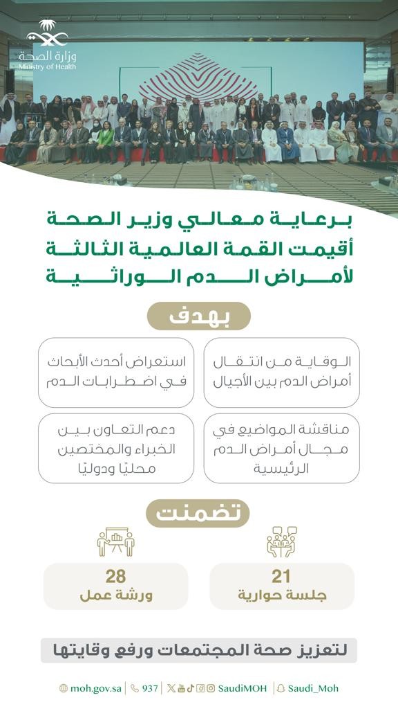 رعي معالي وزير الصحة الأستاذ فهد بن عبدالرحمن الجلاجل مؤتمر القمة العالمية لأمراض الدم الوراثية، الذي استضافته الرياض، بحضور ومشاركة 400 من المختصين والخبراء والباحثين ومقدمي الرعاية الصحية والمنظمات والاتحادات في الداخل والخارج، لبحث ومناقشة واستعراض أحدث المستجدات في مجال أمراض الدم، ضمن إطار جهود الوزارة محلياً وعالمياً للوقاية من الأمراض الوراثية والحد منها.