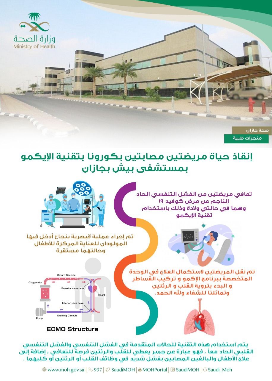 وفي التفاصيل ذكرت صحة جازان بأن المريضتين دخلتا المستشفى وكانتا تعانيان من الإصابة بفايروس كورونا "بكوفيد 19" في حالة ولادة حرجة، وعلى الفور تم التعامل مع المريضتين وإجراء عملية قيصرية بنجاح أدخل فيها المولودان للعناية المركزة للأطفال وحالتهما مستقرة ولله الحمد، فيما احتاجت المريضتان إلى تدخل فريق متخصص من برنامج الإيمكو والذي بدورة عمل على تقييم حالة المريضتين وتركيب القساطر والبدء في تروية القلب والرئتين، وتم نقل المريضتين لاستكمال العلاج في الوحدة المتخصصة ببرنامج الإكمو وتماثلتا للشفاء ولله الحمد.