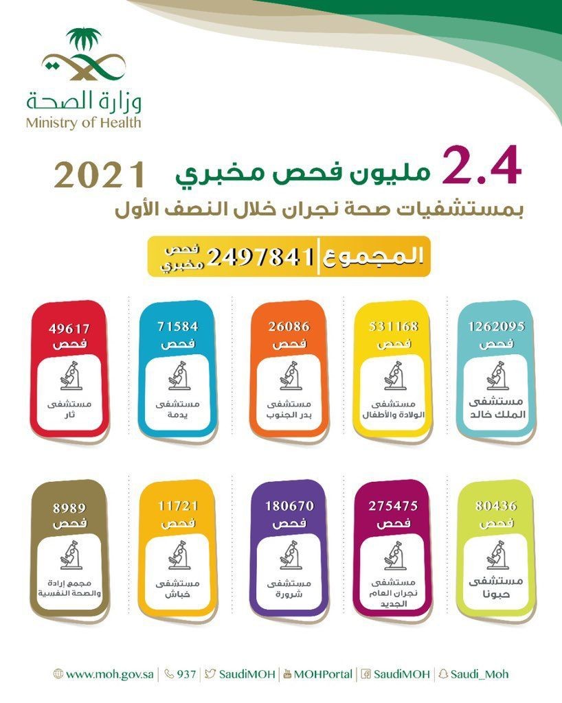 أُجريت في أقسام المختبرات وبنوك الدم بمستشفيات صحة نجران 2497841 فحص مخبري وذلك خلال النصف الأول من العام  2021م .
