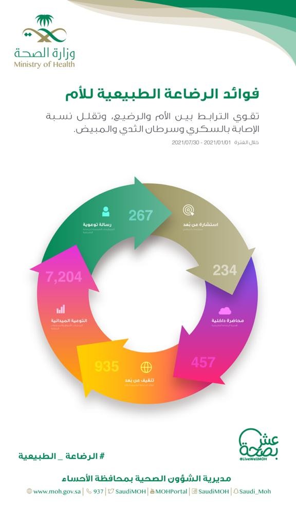أكدت صحة الأحساء أهمية الرضاعة الطبيعية للمرضع والرضيع؛ حيث إن الرضاعة الطبيعية تقي الطفل من العديد من الأمراض والعدوى، وتحتوي على كل ما يحتاجه الطفل للنمو بشكل جيد.