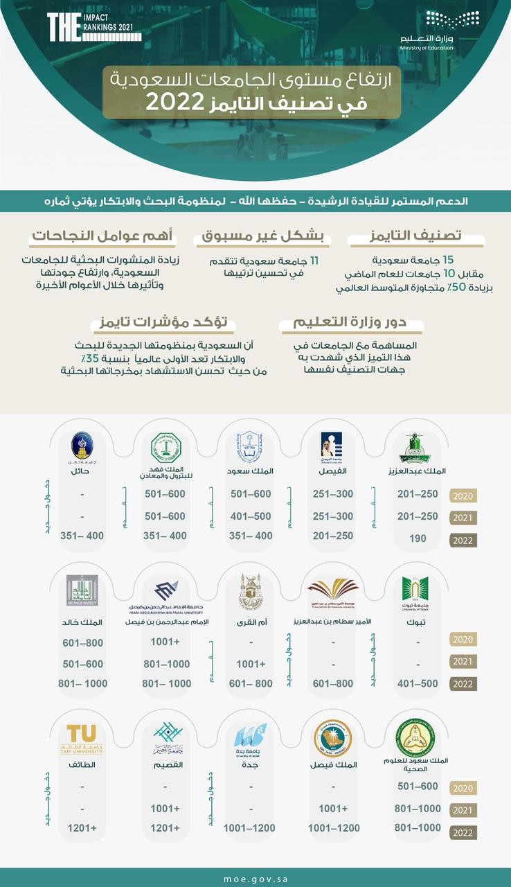 حققت 15 جامعة سعودية إنجازاً وطنياً بتقدمها ضمن الجامعات العالمية وفق تصنيف تايمز الصادر اليوم ، بنسبة تجاوزت 50 % عن التصنيف العام الماضي 2021، والذي حازت فيه 10 جامعات تقدماً في التصنيف.