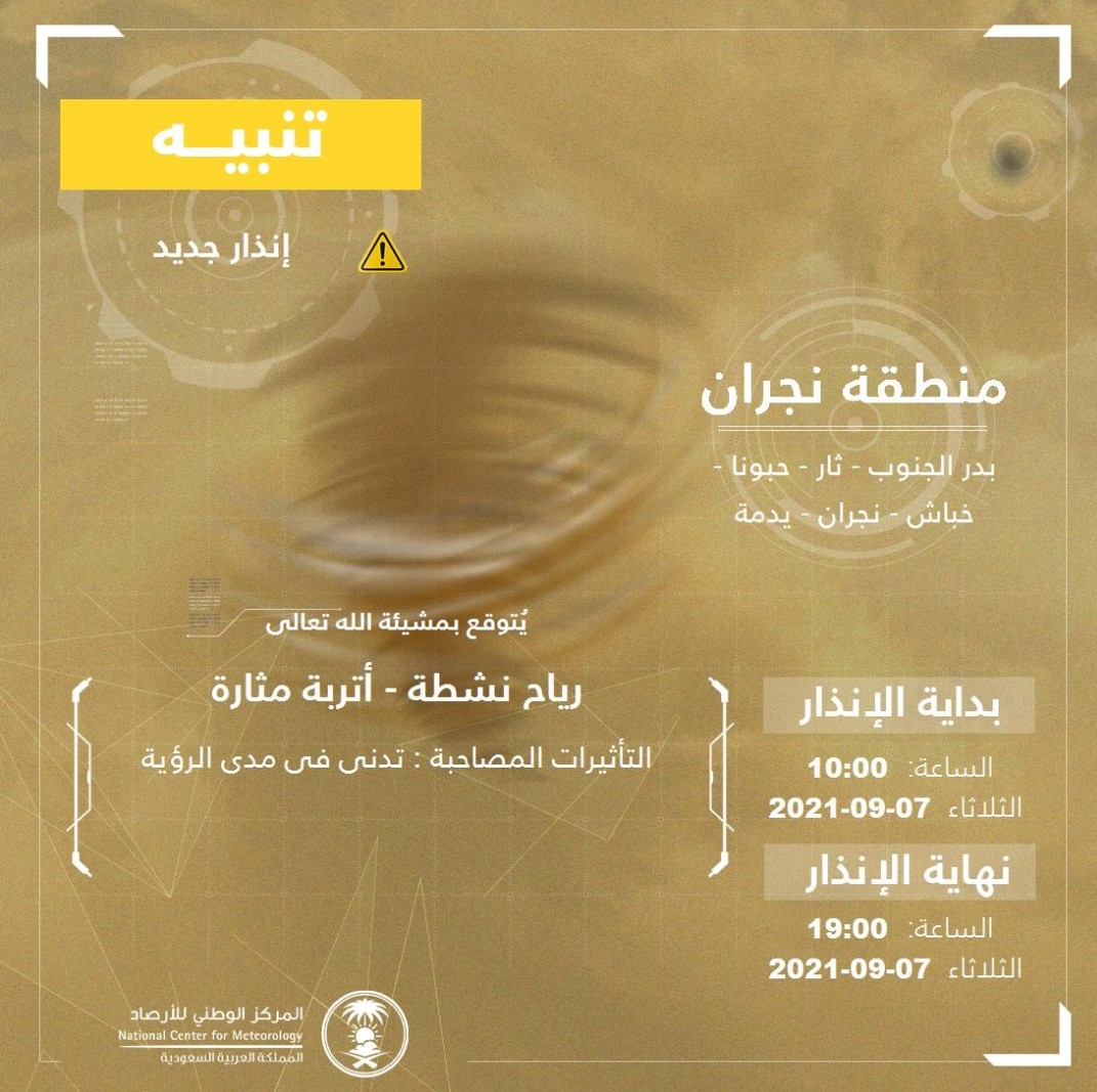 نبه المركز الوطنيّ للأرصاد، من رياح سطحيّة نشطة مثيرة للأتربة والغبار، تؤدّي إلى تدنٍ في مدى الرؤية على منطقة نجران، تشمل مدينة نجران، ومحافظات يدمة، وخبّاش، وثار، وحبوناً، وبدر الجنوب.