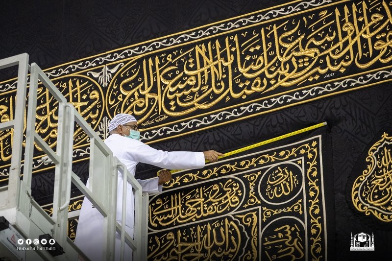 حيث ذكر مدير إدارة صيانة كسوة الكعبة المشرفة بالمسجد الحرام فهد بن حضيض الجابري، أن الإدارة المكلفة بصيانة ثوب الكعبة المشرفة تقوم بالعديد من المهام خلال العام وعلى مدار (٢٤) ساعة على صيانة ثوب الكعبة المشرفة، فنعمل على شد القماش من جميع الجوانب مع تركيب قماش أسود سادة تحت الحلقات المذهبة في الشاذروان، وأيضًا تركيب إطار للحجر الأسود مطرز يدوي بأسلاك الفضة المطلية بالذهب، وتركيب إطار حول الركن اليماني مطرز يدوي بأسلاك الفضة المطلية بالذهب.