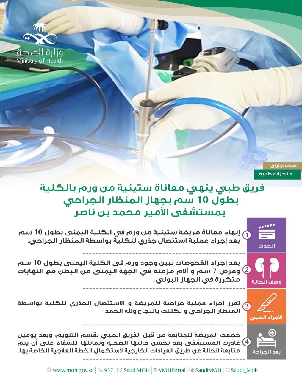 الجدير بالذكر بأن هذه العملية تعد أول عملية استئصال جذري للكلية تجرى بواسطة جهاز المنظار الجراحي بمستشفى الأمير محمد بن ناصر بمنطقة جازان.
