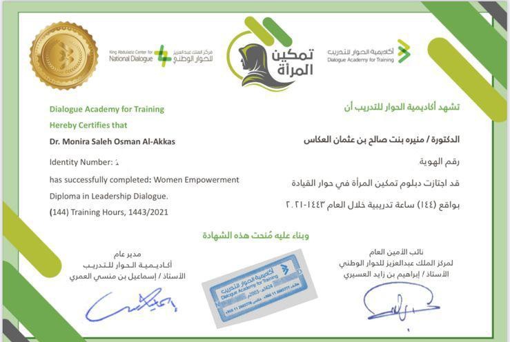 حصلت الدكتورة منيرة العكاس على دبلوم تمكين المرأة في حوار القيادة من أكاديمية الحوار للتدريب بواقع ١٤٤ساعة تدريبية.