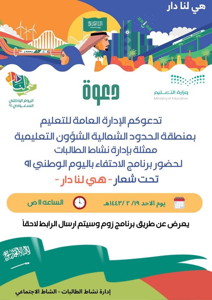 تفقد المدير العام للتعليم بمنطقة الحدود الشمالية الأستاذ عثمان إبراهيم العثمان أركان وفعاليات التعليم المشاركة في حفل المنطقة بمناسبة اليوم الوطني السعودي ٩١ .يرافقه المساعد للشؤون المدرسية.الدكتور فايز سعد العنزي