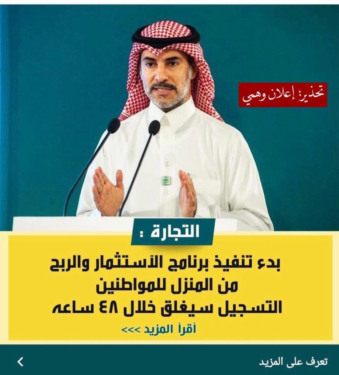 حذرت وزارة التجارة من إعلان إلكتروني كاذب ومضلل يستغل صورة المتحدث الرسمي للوزارة الأستاذ عبدالرحمن الحسين للترويج لاستثمارات تحت مسمى وهمي، وهو : "بدء تنفيذ برنامج الاستثمار والربح من المنزل للمواطنين.. سيغلق خلال 48 ساعة ".