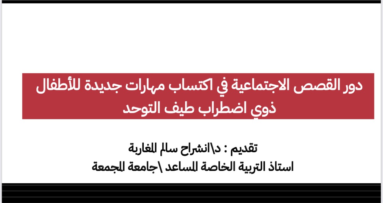 نفذت الجمعية السعودية للتربية الخاصة "جستر" ممثلة في فرع منطقة نجران محاضرة عبر البث المرئي "zoom" بعنوان "دور القصص الإجتماعية في اكتساب مهارات جديدة للأطفال ذوي اضطراب طيف التوحد⁧‫" يوم الثلاثاء الموافق 8 / 9 / 1442هـ ، تقديم الدكتورة انشراح المغاربة - أستاذ مساعد بكلية التربية قسم التربية الخاصة جامعة المجمعة.