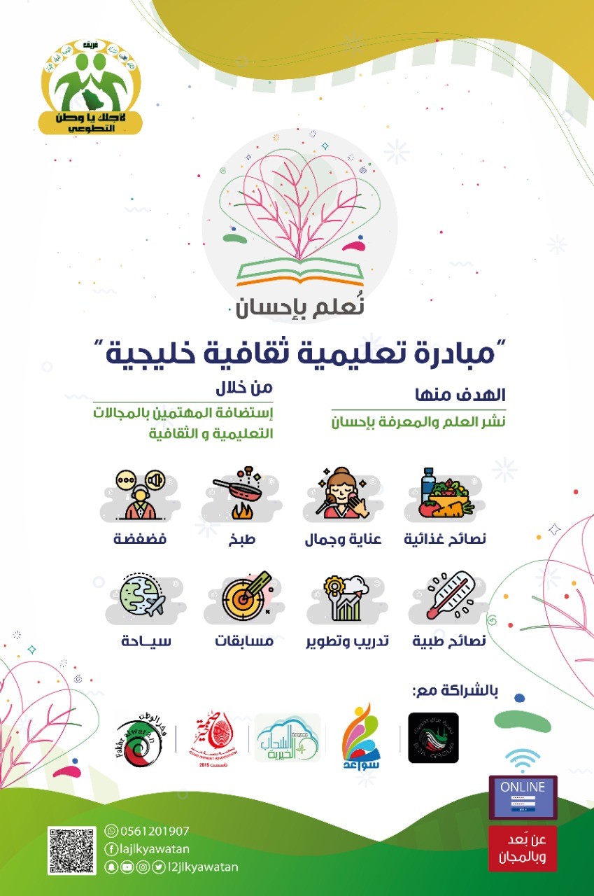 هذا وتهدف المبادرة إلى نشر العلم والمعرفة بإحسان وذلك من خلال استضافة المهتمين بالمجالات التعليمية والثقافية، استغلال أوقات الفراغ لكافة أفراد المجتمع من خلال ورش العمل والأمسيات التطوعية، كما استفاد (12000) بين فئة أطفال وسيدات من داخل وخارج المملكة خاصة أنها كانت (عن بعد).