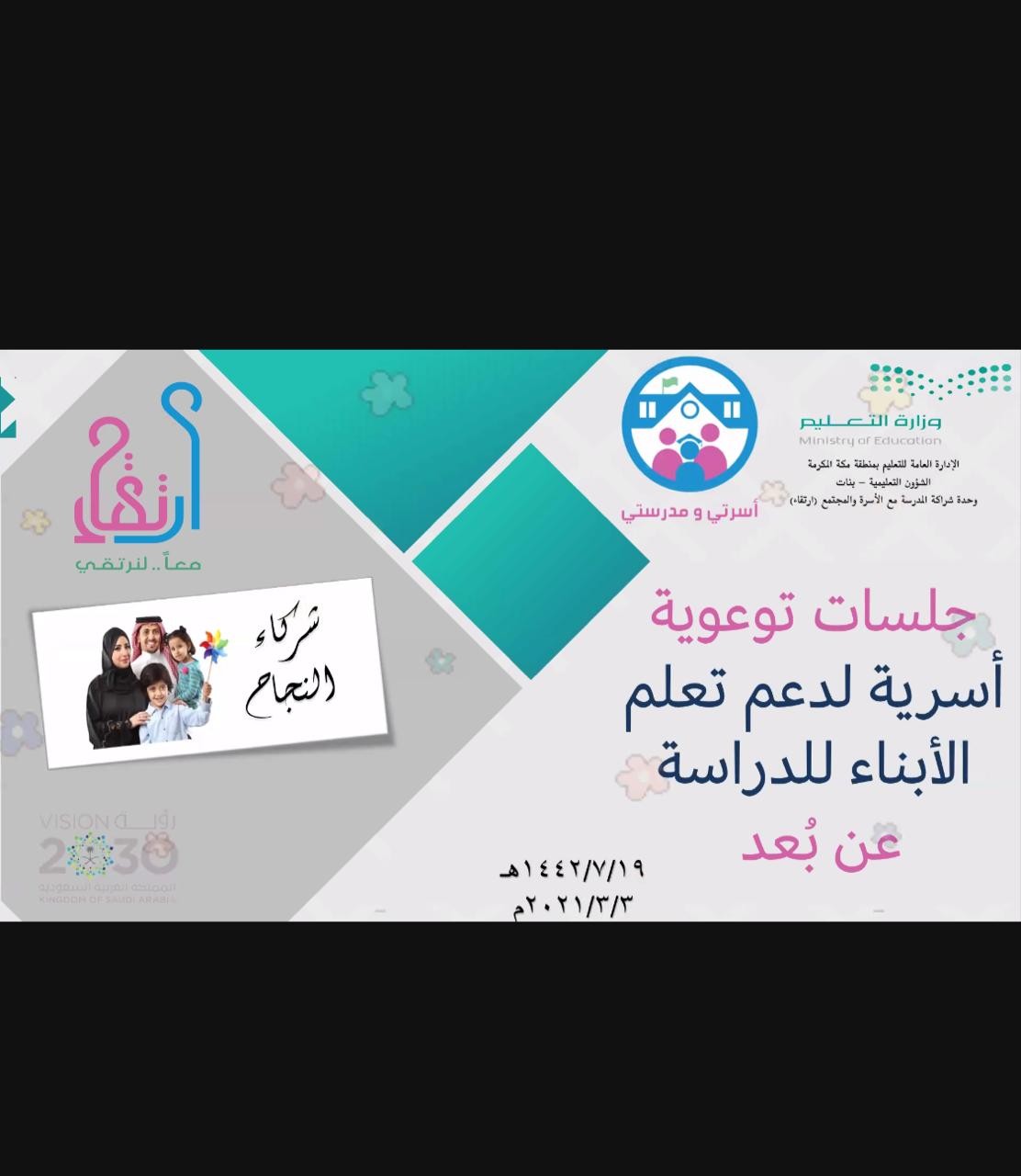 تحت رعاية مساعدة مدير عام التعليم للشؤون التعليمية لمياء بشاوري واصلت الإدارة العامة للتعليم بمنطقة مكة المكرمة ممثلة في وحدة شراكة المدرسة مع الأسرة والمجتمع ( ارتقاء) مساء الأمس الأربعاء الموافق 1442/7/19هـ البرنامج التوعوي "جلسات أسرية" وذلك ضمن تفعيل مبادرة " أسرتي ومدرستي " خلال الفصل الدراسي الثاني لعام 1442هـ تحت إشراف مديرة الوحدة بدرية الغامدي والتي رحبت من خلال كلمتها بالضيفات الكريمات من مشرفات وقائدات للمدارس ورائدات الشراكة وأعضاء لجنة الشراكة في مكاتب التعليم والمدارس ، مشيرة إلى أن أولياء الأمور هم شركاء النجاح ، هذا وعبرت عن فخرها واعتزازها بهم وبحضورهم هذه الجلسات الأسبوعية التوعوية، موضحة أن شراكة المدرسة مع الأسرة والمجتمع تعد إحدى الاستراتيجيات الهامة في تطوير التعليم العام في المملكة العربية السعودية من خلال تجويد ورفع مستوى عملية التعليم والتعلم والمحافظة على قيم المواطنة والعادات الإيجابية للمجتمع السعودي ومشاركة المجتمع المحلي و حيث أن وحدة شراكة المدرسة مع الأسرة والمجتمع "ارتقاء" إحدى الجهات المعنية باالأسرة.