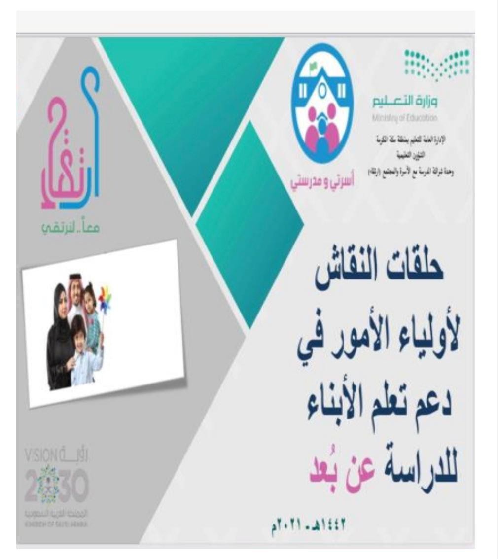 برعاية مساعدة مدير عام التعليم للشؤون التعليمية الأستاذة لمياء بشاوري أطلقت الإدارة العامة للتعليم بمنطقة مكة المكرمة ممثلة في وحدة شراكة المدرسة مع الأسرة والمجتمع "ارتقاء" سلسلة من الجلسات التوعوية الأسرية والتدريب المنظم ضمن مبادرة (أسرتي ومدرستي) وذلك بمعدل ساعة أسبوعيًا من الساعة 7 – 8 مساء خلال الفصل الدراسي الثاني 1442 هـ وذلك عن بعد عبر برنامج الزوم يوم الأربعاء الموافق 1442/7/12هـ وذلك بمساندة كل من إدارة التوجيه والإرشاد، إدارة نشاط الطالبات، إدارة التعليم المستمر ، إدارة التدريب والابتعاث ، إدارة الطفولة المبكرة ، وحدة تطوير المدارس ، وإدارة الجودة وقياس الآداء ومكاتب التعليم وعدد من مشرفات الشراكة المنسقات ورائدات الشراكة في المدارس وذلك تحت إشراف مديرة وحدة ارتقاء بدرية الغامدي.