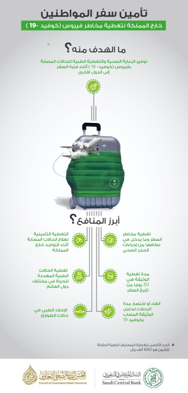 يعلن البنك المركزي السعودي ومجلس الضمان الصحي التعاوني، اعتماد منتج تأمين سفر المواطنين خارج المملكة العربية السعودية، متضمناً منافع تُغطي مخاطر الإصابة بفيروس كورونا (كوفيد - 19).