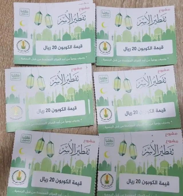 وقد بدأت الجمعية في توزيع البطاقات على الأسر المستفيدة لديها، حيث انه يتم صرفها وشراء المواد الغذائية من السوبر الماركات المجاورة لهم وبنفس قراهم بعدد ٣٠ كوبون لكل اسرة بقيمة ٢٠ ريال طيلة شهر رمضان المبارك تمكنهم هذه البطاقات من الحصول على مشتريات مجانية، ضمن مشروع إفطار الاسر وهو أحد المشاريع الدائمة التي تنفذها الجمعية على مدار السنة .