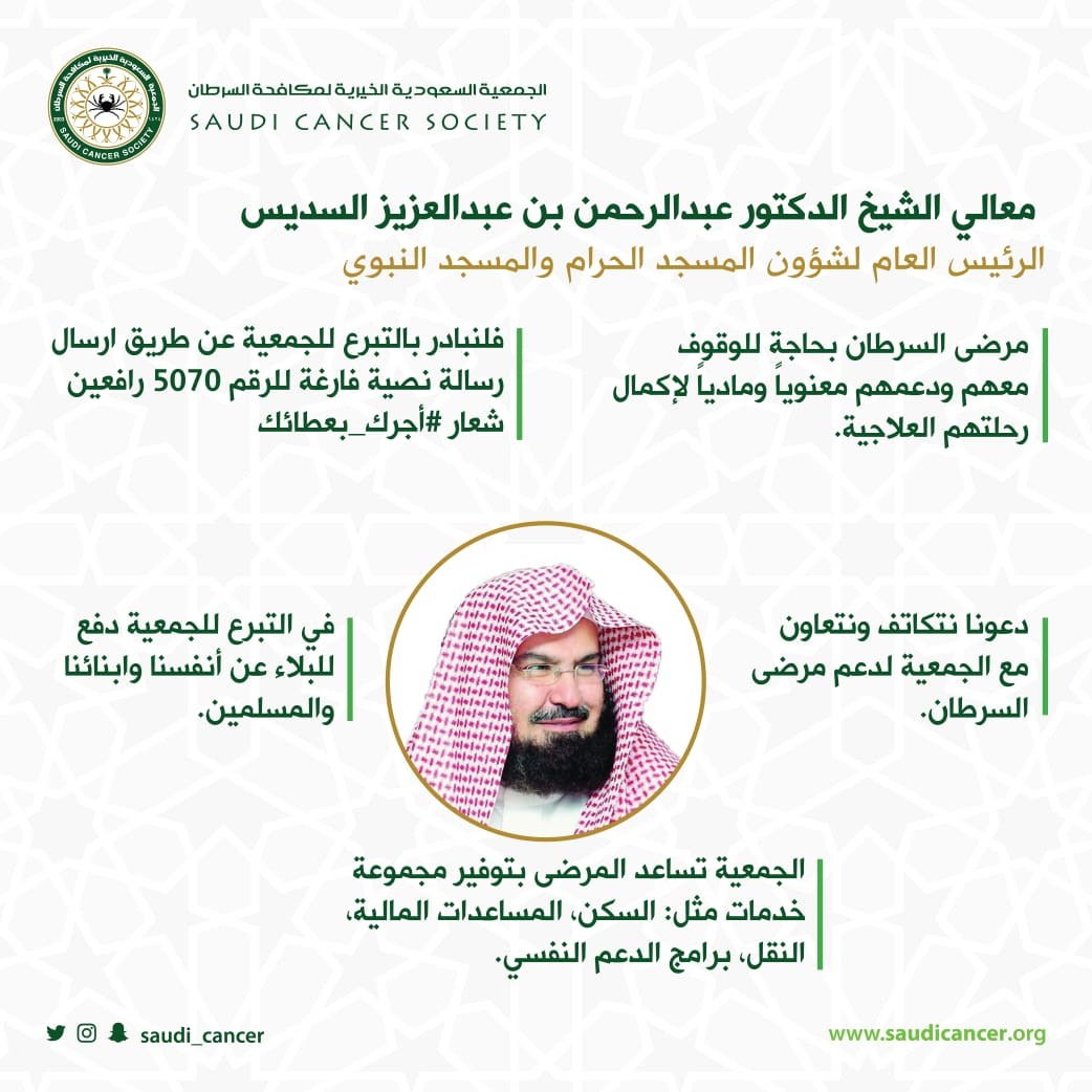 ونوه معالي الشيخ السديس إلى أن الجمعية السعودية الخيرية لمكافحة السرطان مصدر موثوق للتبرع لهم، ومن خلالهم يتم دعم مرضى السرطان، وذلك عن طريق التبرع بإرسال رسالة SMS فارغة الى الرقم (5070) للتبرع بمبلغ 10 ريالات، وللتبرع بمبلغ 12 ريالاً شهرياً ارسل الرقم 1 الى (5070).