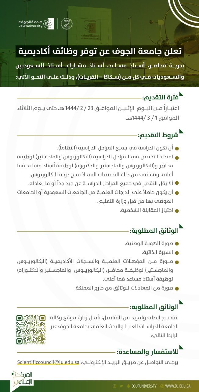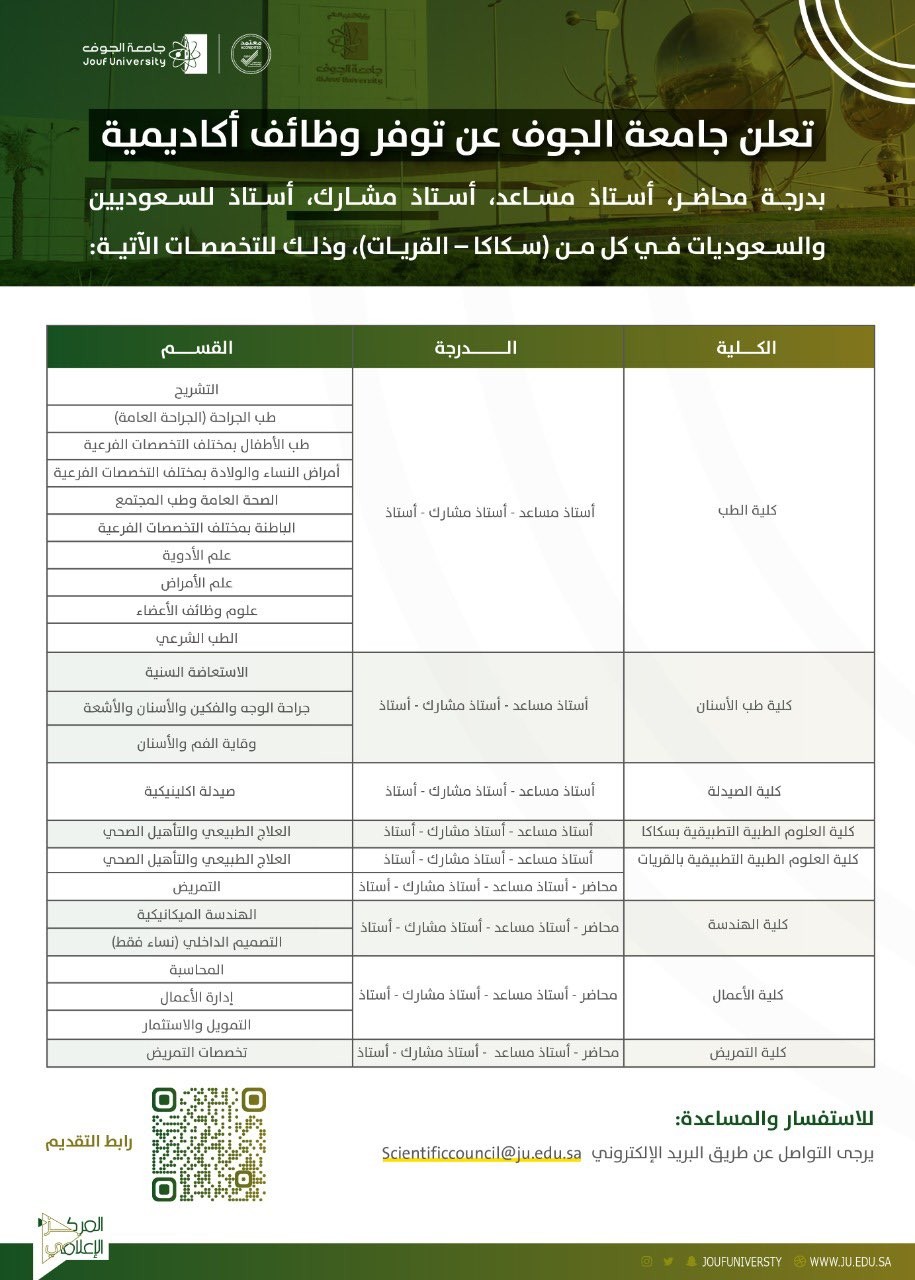 أعلنت جامعة الجوف توفر وظائف أكاديمية بدرجة (محاضر، أستاذ مساعد، أستاذ مشارك، أستاذ) للسعوديين والسعوديات في كل من (سكاكا، القريات)، وذلك على حسب الشروط والتخصصات الموضحة أدناه.