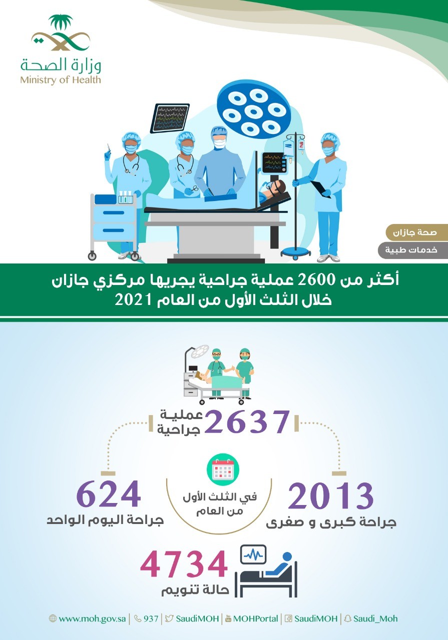 قالت صحة جازان بأن أقسام الجراحة بمستشفى الملك فهد المركزي بجازان قامت بإجراء 2637 عملية جراحية خلال الثلث الأول من العام الميلادي 2021.